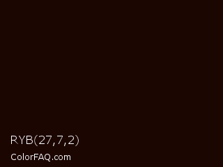 RYB 27,7,2 Color is a almost black red color and the nearest color is Nero #140600. Hex code #1b0602 and RGB value is rgb(27,6,2). In RGB color space, this color is composed of 11% red, 2% green, 1% blue, In CMYK color space, this color is composed of 0% cyan, 78% magenta, 93% yellow , 89% black , In HSL color space, this color has a hue angle of 10° , 86% saturation and 6% lightness.