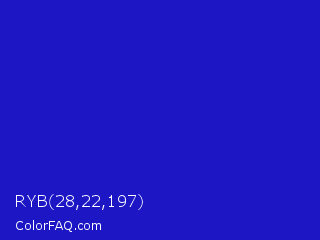 RYB 28,22,197 Color is a normal indigo color and the nearest color is Interdimensional Blue #360ccc. Hex code #1c16c5 and RGB value is rgb(28,22,197). In RGB color space, this color is composed of 11% red, 9% green, 77% blue, In CMYK color space, this color is composed of 86% cyan, 89% magenta, 0% yellow , 23% black , In HSL color space, this color has a hue angle of 242° , 80% saturation and 43% lightness.