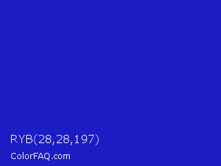 RYB 28,28,197 Color is a normal blue color and the nearest color is Persian Blue #1c39bb. Hex code #1c1cc5 and RGB value is rgb(28,28,197). In RGB color space, this color is composed of 11% red, 11% green, 77% blue, In CMYK color space, this color is composed of 86% cyan, 86% magenta, 0% yellow , 23% black , In HSL color space, this color has a hue angle of 240° , 75% saturation and 44% lightness.