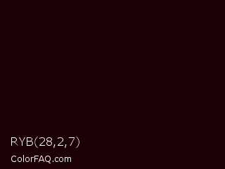 RYB 28,2,7 Color is a almost black red color and the nearest color is Nero #140600. Hex code #1c0207 and RGB value is rgb(28,2,7). In RGB color space, this color is composed of 11% red, 1% green, 3% blue, In CMYK color space, this color is composed of 0% cyan, 93% magenta, 75% yellow , 89% black , In HSL color space, this color has a hue angle of 348° , 87% saturation and 6% lightness.