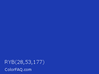 RYB 28,53,177 Color is a normal blue color and the nearest color is Persian Blue #1c39bb. Hex code #1c3ab1 and RGB value is rgb(28,58,177). In RGB color space, this color is composed of 11% red, 23% green, 69% blue, In CMYK color space, this color is composed of 84% cyan, 67% magenta, 0% yellow , 31% black , In HSL color space, this color has a hue angle of 228° , 73% saturation and 40% lightness.