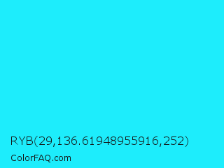 RYB 29,136.61948955916,252 Color is a normal cyan color and the nearest color is Loeen #15f2fd. Hex code #1dedfc and RGB value is rgb(29,237,252). In RGB color space, this color is composed of 11% red, 93% green, 99% blue, In CMYK color space, this color is composed of 88% cyan, 6% magenta, 0% yellow , 1% black , In HSL color space, this color has a hue angle of 184° , 97% saturation and 55% lightness.