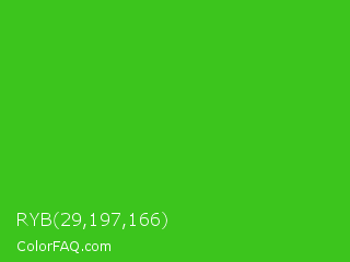RYB 29,197,166 Color is a normal green color and the nearest color is Harlequin Green #46cb18. Hex code #3cc51d and RGB value is rgb(60,197,29). In RGB color space, this color is composed of 24% red, 77% green, 11% blue, In CMYK color space, this color is composed of 70% cyan, 0% magenta, 85% yellow , 23% black , In HSL color space, this color has a hue angle of 109° , 74% saturation and 44% lightness.