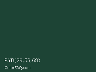 RYB 29,53,68 Color is a very dark green color and the nearest color is Te Papa Green #1e433c. Hex code #1d4435 and RGB value is rgb(29,68,53). In RGB color space, this color is composed of 11% red, 27% green, 21% blue, In CMYK color space, this color is composed of 57% cyan, 0% magenta, 22% yellow , 73% black , In HSL color space, this color has a hue angle of 157° , 40% saturation and 19% lightness.