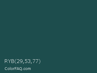 RYB 29,53,77 Color is a very dark cyan color and the nearest color is Blue Dianne #204852. Hex code #1d4d4d and RGB value is rgb(29,77,77). In RGB color space, this color is composed of 11% red, 30% green, 30% blue, In CMYK color space, this color is composed of 62% cyan, 0% magenta, 0% yellow , 70% black , In HSL color space, this color has a hue angle of 180° , 45% saturation and 21% lightness.