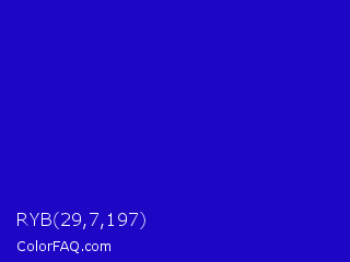 RYB 29,7,197 Color is a normal indigo color and the nearest color is Interdimensional Blue #360ccc. Hex code #1d07c5 and RGB value is rgb(29,7,197). In RGB color space, this color is composed of 11% red, 3% green, 77% blue, In CMYK color space, this color is composed of 85% cyan, 96% magenta, 0% yellow , 23% black , In HSL color space, this color has a hue angle of 247° , 93% saturation and 40% lightness.