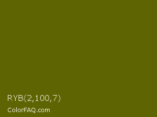 RYB 2,100,7 Color is a very dark yellow color and the nearest color is Saratoga #555b10. Hex code #5f6402 and RGB value is rgb(95,100,2). In RGB color space, this color is composed of 37% red, 39% green, 1% blue, In CMYK color space, this color is composed of 5% cyan, 0% magenta, 98% yellow , 61% black , In HSL color space, this color has a hue angle of 63° , 96% saturation and 20% lightness.