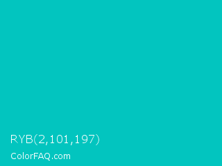 RYB 2,101,197 Color is a normal cyan color and the nearest color is Turquoise Surf #00c5cd. Hex code #02c5bf and RGB value is rgb(2,197,191). In RGB color space, this color is composed of 1% red, 77% green, 75% blue, In CMYK color space, this color is composed of 99% cyan, 0% magenta, 3% yellow , 23% black , In HSL color space, this color has a hue angle of 178° , 98% saturation and 39% lightness.