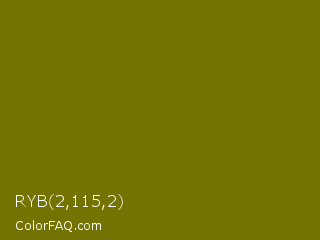 RYB 2,115,2 Color is a dark yellow color and the nearest color is Bronze Yellow #737000. Hex code #737302 and RGB value is rgb(115,115,2). In RGB color space, this color is composed of 45% red, 45% green, 1% blue, In CMYK color space, this color is composed of 0% cyan, 0% magenta, 98% yellow , 55% black , In HSL color space, this color has a hue angle of 60° , 97% saturation and 23% lightness.
