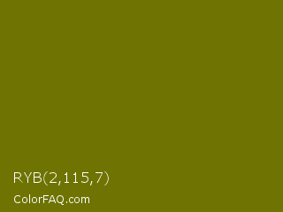 RYB 2,115,7 Color is a dark yellow color and the nearest color is Bronze Yellow #737000. Hex code #6e7302 and RGB value is rgb(110,115,2). In RGB color space, this color is composed of 43% red, 45% green, 1% blue, In CMYK color space, this color is composed of 4% cyan, 0% magenta, 98% yellow , 55% black , In HSL color space, this color has a hue angle of 63° , 97% saturation and 23% lightness.
