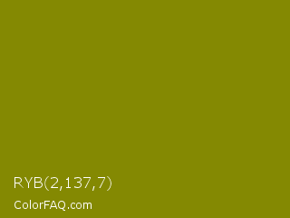 RYB 2,137,7 Color is a dark yellow color and the nearest color is Olive #808000. Hex code #848902 and RGB value is rgb(132,137,2). In RGB color space, this color is composed of 52% red, 54% green, 1% blue, In CMYK color space, this color is composed of 4% cyan, 0% magenta, 99% yellow , 46% black , In HSL color space, this color has a hue angle of 62° , 97% saturation and 27% lightness.