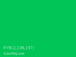 RYB 2,138,197 Color is a normal green color and the nearest color is Malachite #0bda51. Hex code #02c557 and RGB value is rgb(2,197,87). In RGB color space, this color is composed of 1% red, 77% green, 34% blue, In CMYK color space, this color is composed of 99% cyan, 0% magenta, 56% yellow , 23% black , In HSL color space, this color has a hue angle of 146° , 98% saturation and 39% lightness.