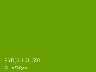 RYB 2,161,58 Color is a normal green color and the nearest color is Limeade #6f9d02. Hex code #69a102 and RGB value is rgb(105,161,2). In RGB color space, this color is composed of 41% red, 63% green, 1% blue, In CMYK color space, this color is composed of 35% cyan, 0% magenta, 99% yellow , 37% black , In HSL color space, this color has a hue angle of 81° , 98% saturation and 32% lightness.