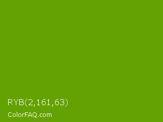 RYB 2,161,63 Color is a normal green color and the nearest color is Limeade #6f9d02. Hex code #64a102 and RGB value is rgb(100,161,2). In RGB color space, this color is composed of 39% red, 63% green, 1% blue, In CMYK color space, this color is composed of 38% cyan, 0% magenta, 99% yellow , 37% black , In HSL color space, this color has a hue angle of 83° , 98% saturation and 32% lightness.