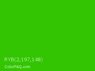 RYB 2,197,148 Color is a normal green color and the nearest color is Harlequin Green #46cb18. Hex code #33c502 and RGB value is rgb(51,197,2). In RGB color space, this color is composed of 20% red, 77% green, 1% blue, In CMYK color space, this color is composed of 74% cyan, 0% magenta, 99% yellow , 23% black , In HSL color space, this color has a hue angle of 105° , 98% saturation and 39% lightness.