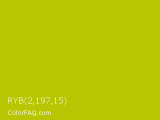 RYB 2,197,15 Color is a normal yellow color and the nearest color is Rio Grande #bbd009. Hex code #b8c502 and RGB value is rgb(184,197,2). In RGB color space, this color is composed of 72% red, 77% green, 1% blue, In CMYK color space, this color is composed of 7% cyan, 0% magenta, 99% yellow , 23% black , In HSL color space, this color has a hue angle of 64° , 98% saturation and 39% lightness.