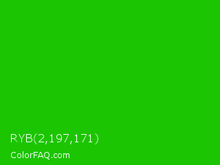 RYB 2,197,171 Color is a normal green color and the nearest color is Harlequin Green #46cb18. Hex code #1cc502 and RGB value is rgb(28,197,2). In RGB color space, this color is composed of 11% red, 77% green, 1% blue, In CMYK color space, this color is composed of 86% cyan, 0% magenta, 99% yellow , 23% black , In HSL color space, this color has a hue angle of 112° , 98% saturation and 39% lightness.