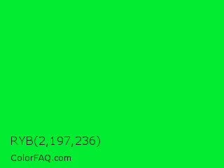 RYB 2,197,236 Color is a normal green color and the nearest color is Vivid Malachite #00cc33. Hex code #02ec31 and RGB value is rgb(2,236,49). In RGB color space, this color is composed of 1% red, 93% green, 19% blue, In CMYK color space, this color is composed of 99% cyan, 0% magenta, 79% yellow , 7% black , In HSL color space, this color has a hue angle of 132° , 98% saturation and 47% lightness.