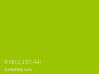 RYB 2,197,44 Color is a normal lime color and the nearest color is Pistachio Green #9dc209. Hex code #9bc502 and RGB value is rgb(155,197,2). In RGB color space, this color is composed of 61% red, 77% green, 1% blue, In CMYK color space, this color is composed of 21% cyan, 0% magenta, 99% yellow , 23% black , In HSL color space, this color has a hue angle of 73° , 98% saturation and 39% lightness.