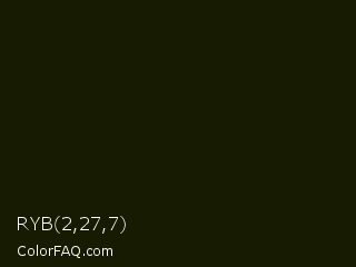 RYB 2,27,7 Color is a almost black lime color and the nearest color is Pine Tree #171f04. Hex code #161b02 and RGB value is rgb(22,27,2). In RGB color space, this color is composed of 9% red, 11% green, 1% blue, In CMYK color space, this color is composed of 19% cyan, 0% magenta, 93% yellow , 89% black , In HSL color space, this color has a hue angle of 72° , 86% saturation and 6% lightness.