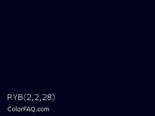 RYB 2,2,28 Color is a almost black blue color and the nearest color is Black Russian #0a001c. Hex code #02021c and RGB value is rgb(2,2,28). In RGB color space, this color is composed of 1% red, 1% green, 11% blue, In CMYK color space, this color is composed of 93% cyan, 93% magenta, 0% yellow , 89% black , In HSL color space, this color has a hue angle of 240° , 87% saturation and 6% lightness.