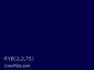RYB 2,2,75 Color is a very dark blue color and the nearest color is Stratos #000741. Hex code #02024b and RGB value is rgb(2,2,75). In RGB color space, this color is composed of 1% red, 1% green, 29% blue, In CMYK color space, this color is composed of 97% cyan, 97% magenta, 0% yellow , 71% black , In HSL color space, this color has a hue angle of 240° , 95% saturation and 15% lightness.