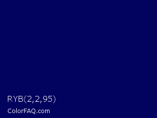 RYB 2,2,95 Color is a very dark blue color and the nearest color is Gulf Blue #051657. Hex code #02025f and RGB value is rgb(2,2,95). In RGB color space, this color is composed of 1% red, 1% green, 37% blue, In CMYK color space, this color is composed of 98% cyan, 98% magenta, 0% yellow , 63% black , In HSL color space, this color has a hue angle of 240° , 96% saturation and 19% lightness.