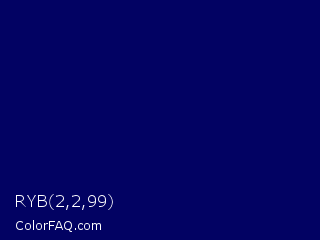 RYB 2,2,99 Color is a very dark blue color and the nearest color is Arapawa #110c6c. Hex code #020263 and RGB value is rgb(2,2,99). In RGB color space, this color is composed of 1% red, 1% green, 39% blue, In CMYK color space, this color is composed of 98% cyan, 98% magenta, 0% yellow , 61% black , In HSL color space, this color has a hue angle of 240° , 96% saturation and 20% lightness.