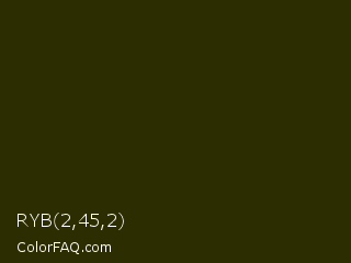RYB 2,45,2 Color is a almost black yellow color and the nearest color is Onion #2f270e. Hex code #2d2d02 and RGB value is rgb(45,45,2). In RGB color space, this color is composed of 18% red, 18% green, 1% blue, In CMYK color space, this color is composed of 0% cyan, 0% magenta, 96% yellow , 82% black , In HSL color space, this color has a hue angle of 60° , 91% saturation and 9% lightness.