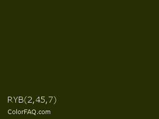 RYB 2,45,7 Color is a almost black yellow color and the nearest color is Turtle Green #2a380b. Hex code #282d02 and RGB value is rgb(40,45,2). In RGB color space, this color is composed of 16% red, 18% green, 1% blue, In CMYK color space, this color is composed of 11% cyan, 0% magenta, 96% yellow , 82% black , In HSL color space, this color has a hue angle of 67° , 91% saturation and 9% lightness.