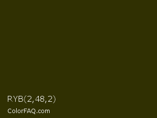 RYB 2,48,2 Color is a very dark yellow color and the nearest color is Turtle Green #2a380b. Hex code #303002 and RGB value is rgb(48,48,2). In RGB color space, this color is composed of 19% red, 19% green, 1% blue, In CMYK color space, this color is composed of 0% cyan, 0% magenta, 96% yellow , 81% black , In HSL color space, this color has a hue angle of 60° , 92% saturation and 10% lightness.