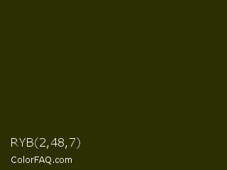 RYB 2,48,7 Color is a very dark yellow color and the nearest color is Turtle Green #2a380b. Hex code #2b3002 and RGB value is rgb(43,48,2). In RGB color space, this color is composed of 17% red, 19% green, 1% blue, In CMYK color space, this color is composed of 10% cyan, 0% magenta, 96% yellow , 81% black , In HSL color space, this color has a hue angle of 67° , 92% saturation and 10% lightness.