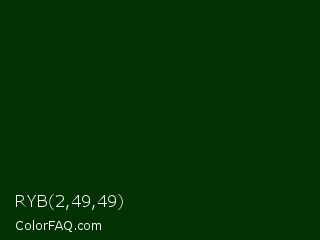 RYB 2,49,49 Color is a very dark green color and the nearest color is Deep Fir #002900. Hex code #023102 and RGB value is rgb(2,49,2). In RGB color space, this color is composed of 1% red, 19% green, 1% blue, In CMYK color space, this color is composed of 96% cyan, 0% magenta, 96% yellow , 81% black , In HSL color space, this color has a hue angle of 120° , 92% saturation and 10% lightness.
