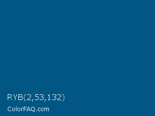 RYB 2,53,132 Color is a dark blue color and the nearest color is Venice Blue #055989. Hex code #025684 and RGB value is rgb(2,86,132). In RGB color space, this color is composed of 1% red, 34% green, 52% blue, In CMYK color space, this color is composed of 98% cyan, 35% magenta, 0% yellow , 48% black , In HSL color space, this color has a hue angle of 201° , 97% saturation and 26% lightness.