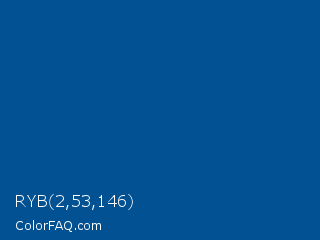 RYB 2,53,146 Color is a dark blue color and the nearest color is Medium Electric Blue #035096. Hex code #025192 and RGB value is rgb(2,81,146). In RGB color space, this color is composed of 1% red, 32% green, 57% blue, In CMYK color space, this color is composed of 99% cyan, 45% magenta, 0% yellow , 43% black , In HSL color space, this color has a hue angle of 207° , 97% saturation and 29% lightness.