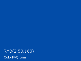 RYB 2,53,168 Color is a normal blue color and the nearest color is Cobalt #0047ab. Hex code #024ca8 and RGB value is rgb(2,76,168). In RGB color space, this color is composed of 1% red, 30% green, 66% blue, In CMYK color space, this color is composed of 99% cyan, 55% magenta, 0% yellow , 34% black , In HSL color space, this color has a hue angle of 213° , 98% saturation and 33% lightness.