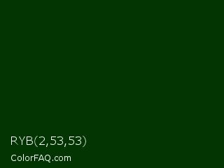 RYB 2,53,53 Color is a very dark green color and the nearest color is Deep Fir #002900. Hex code #023502 and RGB value is rgb(2,53,2). In RGB color space, this color is composed of 1% red, 21% green, 1% blue, In CMYK color space, this color is composed of 96% cyan, 0% magenta, 96% yellow , 79% black , In HSL color space, this color has a hue angle of 120° , 93% saturation and 11% lightness.