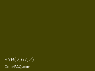 RYB 2,67,2 Color is a very dark yellow color and the nearest color is Bronze Olive #4e420c. Hex code #434302 and RGB value is rgb(67,67,2). In RGB color space, this color is composed of 26% red, 26% green, 1% blue, In CMYK color space, this color is composed of 0% cyan, 0% magenta, 97% yellow , 74% black , In HSL color space, this color has a hue angle of 60° , 94% saturation and 14% lightness.