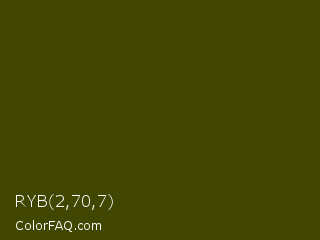 RYB 2,70,7 Color is a very dark yellow color and the nearest color is Verdun Green #495400. Hex code #414602 and RGB value is rgb(65,70,2). In RGB color space, this color is composed of 25% red, 27% green, 1% blue, In CMYK color space, this color is composed of 7% cyan, 0% magenta, 97% yellow , 73% black , In HSL color space, this color has a hue angle of 64° , 94% saturation and 14% lightness.