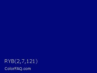 RYB 2,7,121 Color is a dark blue color and the nearest color is Navy Blue #000080. Hex code #020779 and RGB value is rgb(2,7,121). In RGB color space, this color is composed of 1% red, 3% green, 47% blue, In CMYK color space, this color is composed of 98% cyan, 94% magenta, 0% yellow , 53% black , In HSL color space, this color has a hue angle of 237° , 97% saturation and 24% lightness.