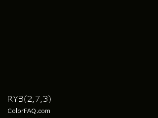 RYB 2,7,3 Color is a almost black lime color and the nearest color is Rich Black FOGRA39 #010203. Hex code #060702 and RGB value is rgb(6,7,2). In RGB color space, this color is composed of 2% red, 3% green, 1% blue, In CMYK color space, this color is composed of 14% cyan, 0% magenta, 71% yellow , 97% black , In HSL color space, this color has a hue angle of 72° , 56% saturation and 2% lightness.