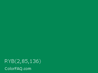RYB 2,85,136 Color is a dark green color and the nearest color is Spanish Green #009150. Hex code #028854 and RGB value is rgb(2,136,84). In RGB color space, this color is composed of 1% red, 53% green, 33% blue, In CMYK color space, this color is composed of 99% cyan, 0% magenta, 38% yellow , 47% black , In HSL color space, this color has a hue angle of 157° , 97% saturation and 27% lightness.