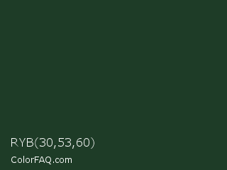 RYB 30,53,60 Color is a very dark green color and the nearest color is Everglade #1c402e. Hex code #1e3c27 and RGB value is rgb(30,60,39). In RGB color space, this color is composed of 12% red, 24% green, 15% blue, In CMYK color space, this color is composed of 50% cyan, 0% magenta, 35% yellow , 76% black , In HSL color space, this color has a hue angle of 138° , 33% saturation and 18% lightness.