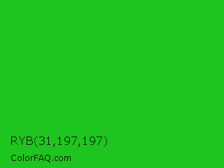 RYB 31,197,197 Color is a normal green color and the nearest color is Lime Green #32cd32. Hex code #1fc51f and RGB value is rgb(31,197,31). In RGB color space, this color is composed of 12% red, 77% green, 12% blue, In CMYK color space, this color is composed of 84% cyan, 0% magenta, 84% yellow , 23% black , In HSL color space, this color has a hue angle of 120° , 73% saturation and 45% lightness.