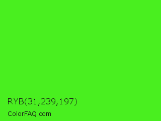 RYB 31,239,197 Color is a normal green color and the nearest color is Neon Green #39ff14. Hex code #49ef1f and RGB value is rgb(73,239,31). In RGB color space, this color is composed of 29% red, 94% green, 12% blue, In CMYK color space, this color is composed of 69% cyan, 0% magenta, 87% yellow , 6% black , In HSL color space, this color has a hue angle of 108° , 87% saturation and 53% lightness.