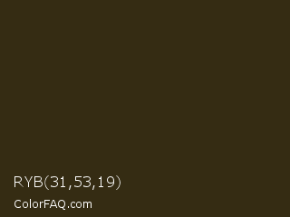 RYB 31,53,19 Color is a very dark orange color and the nearest color is Brown Tumbleweed #37290e. Hex code #352c13 and RGB value is rgb(53,44,19). In RGB color space, this color is composed of 21% red, 17% green, 7% blue, In CMYK color space, this color is composed of 0% cyan, 17% magenta, 64% yellow , 79% black , In HSL color space, this color has a hue angle of 44° , 47% saturation and 14% lightness.