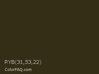 RYB 31,53,22 Color is a very dark yellow color and the nearest color is Woodrush #302a0f. Hex code #352e16 and RGB value is rgb(53,46,22). In RGB color space, this color is composed of 21% red, 18% green, 9% blue, In CMYK color space, this color is composed of 0% cyan, 13% magenta, 58% yellow , 79% black , In HSL color space, this color has a hue angle of 46° , 41% saturation and 15% lightness.