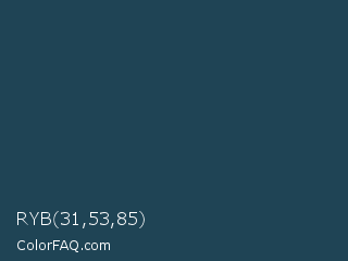 RYB 31,53,85 Color is a dark blue color and the nearest color is Blue Dianne #204852. Hex code #1f4455 and RGB value is rgb(31,68,85). In RGB color space, this color is composed of 12% red, 27% green, 33% blue, In CMYK color space, this color is composed of 64% cyan, 20% magenta, 0% yellow , 67% black , In HSL color space, this color has a hue angle of 199° , 47% saturation and 23% lightness.