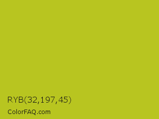 RYB 32,197,45 Color is a normal yellow color and the nearest color is Key Lime Pie #bfc921. Hex code #b8c520 and RGB value is rgb(184,197,32). In RGB color space, this color is composed of 72% red, 77% green, 13% blue, In CMYK color space, this color is composed of 7% cyan, 0% magenta, 84% yellow , 23% black , In HSL color space, this color has a hue angle of 65° , 72% saturation and 45% lightness.