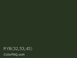 RYB 32,53,45 Color is a very dark green color and the nearest color is Green Kelp #25311c. Hex code #283520 and RGB value is rgb(40,53,32). In RGB color space, this color is composed of 16% red, 21% green, 13% blue, In CMYK color space, this color is composed of 25% cyan, 0% magenta, 40% yellow , 79% black , In HSL color space, this color has a hue angle of 97° , 25% saturation and 17% lightness.